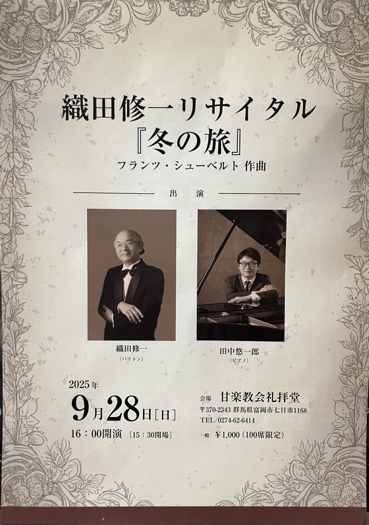 2025年9月20日 / 最終更新日時 : 2025年9月20日 staff.c SCHEDULE 織田修一リサイタル『冬の旅』 2025年 9月28日(日) 16:00開演 [開場15:30] 会場 甘楽教会礼拝堂 (〒370-2343 群馬県富岡市七日市1168) 一般 1000円(100席限定) 《出演》 バリトン 織田 修一 ピアノ 田中 悠一郎 チケットのお取り扱いは、サイトお問い合わせページよりご連絡をお願いいたします。 Follow me! FacebooktwitterHatenaPocket